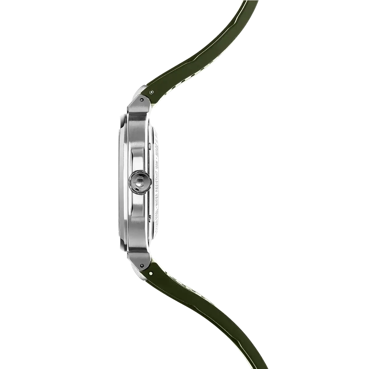 Bracelet caoutchouc FKM kaki hypoallergénique, boucle ardillon acier, poids 98 g et étanchéité 100 mètres : sportivité raffinée et confort absolu.