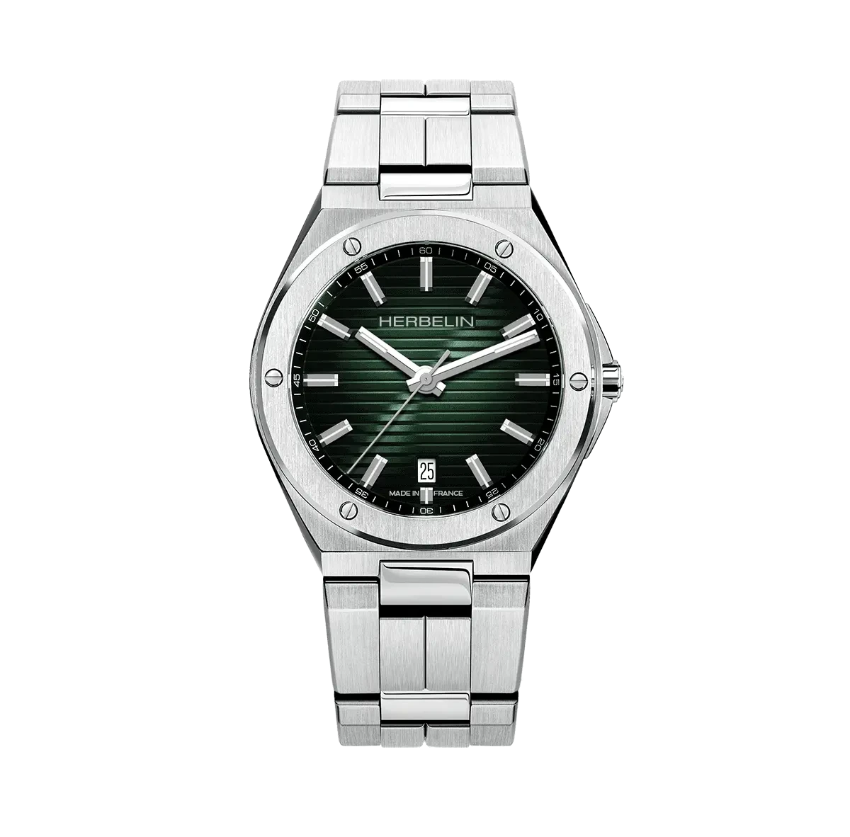 Montre quartz suisse au boîtier rond 40,5 mm en acier 316L poli/satiné. Cadran vert dégradé horizontal, index appliques et aiguilles réfléchissant la lumière, date à 6 h.