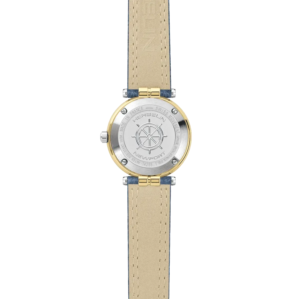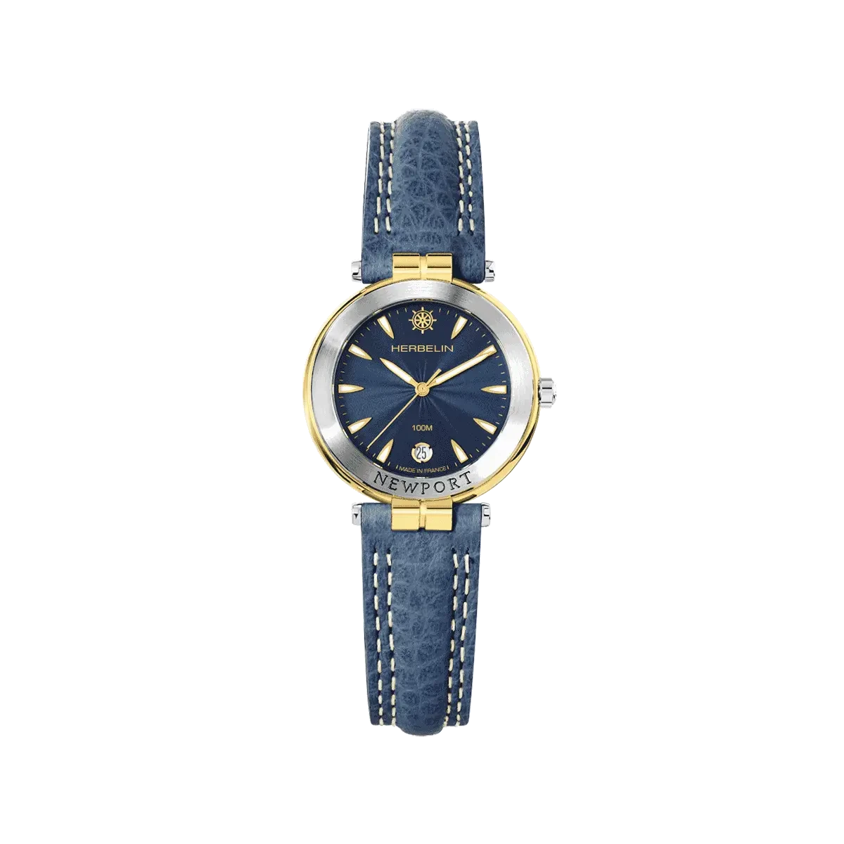 Sous les vagues scintillantes de l'océan Atlantique, où les voiles françaises ont gravé des triomphes inoubliables en 1989, pulse l'essence originale de la Newport Originals 14255T35. Inspirée des hublots des navires transatlantiques et dotée d'une forte personnalité, Newport est le modèle emblématique de la Maison Herbelin. Cette montre, qui se singularise par son bracelet en cuir bleu et son cadran habillé d'une roue de marine à midi, épouse avec délicatesse les courbes des poignets féminins. L'aspect bicolore du cadran et de ses attaches en acier et PVD or jaune fait d'elle un garde-temps authentique. Fabriquée en France depuis 1947 dans les ateliers de Charquemont en Franche-Comté, avec un savoir-faire horloger d'excellence.
