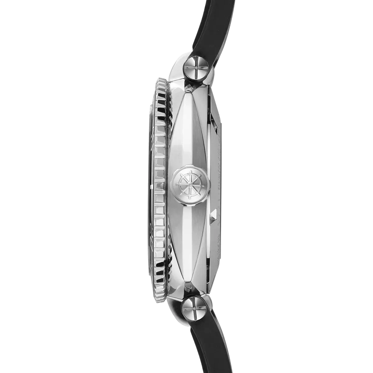 Son design se distingue par un boîtier en acier inoxydable solide associé à un cadran noir profond, offrant une esthétique sobre et impactante. Les index et aiguilles sont conçus pour garantir une lisibilité optimale, même dans des conditions difficiles. La lunette tournante unidirectionnelle renforce son identité de montre de plongée tout en apportant une fonctionnalité essentielle.